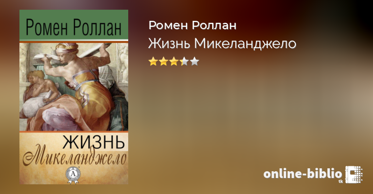 «Жизнь Микеланджело» – классическая проза французского писателя, лауреата Нобелевской премии по литературе Ромена Роллана (фр. Romain Rolland, 1866-1944) ***. Конфликт между мечтой и действием остается центральной проблемой для человека. В произведении «Жизнь Микеланджело» ярко показаны внутренние противоречия одного из могущественных титанов эпохи Возрождения – Микеланджело. На примере жизни гения автор показал, как бороться с трудностями, падать и, вставая, распрямлять крылья, страдать и при этом находить вдохновение в муках. Среди других его произведений биографического жанра можно выделить цикл «Героические жизни»(«Vies hero’i’ques»), в который вошли книги о великих деятелях: «Жизнь Бетховена» («Vie de Beethoven», 1903), «Жизнь Толстого» («Vie de Tolstoi», 1911). Ромен Роллан – реалист XX в, один из великих французских писателей, музыковед, художник нового типа, который с помощью своего творчества внес в западноевропейскую литературу героический пласт, веру в людские возможности. Это писатель, который отдал все свои силы борьбе за человека, за его достоинства и свободу