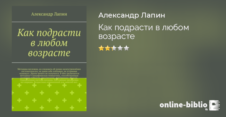 Александр Лапин, Как подрасти в любом возрасте. Методика несложна, но следовать ей нужно целеустремлённо систематически, не давая себе поблажек, не устраивая «каникул». Иначе ничего не получится. В чём заключается методика? Специфическая гимнастика, способствующая развитию гибкости. Закаливание. Аутотренинг. Массаж. Определённая система питания. Постоянная тренировка на снарядах. Возрастных ограничений для занятий нет. — скачать в fb2, txt, epub или pdf