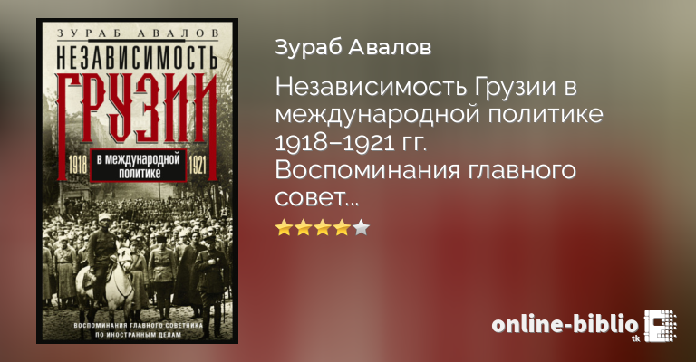 Выдающийся грузинский историк, дипломат и политический деятель князь Зураб Давидович Авалов (Авалишвили) в своей книге изложил историю независимой Грузинской Демократической Республики, оказавшейся в 1918 г. на распутье между Западом и Советской Россией. Автор, непосредственный участник событий эпохи, отобразил процесс «самоустроения молодой жизнеспособной демократии» и зарождения независимого грузинского государства, отметив, что в этот период страна была близка к международному признанию своей независимости, а также описал крушение в 1921 г. института представительной демократии Грузии под натиском советской политики и вхождение Грузии в состав СССР.