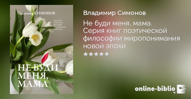 Книга «Не буди меня, мама» представляет серию книг Владимира Симонова «Поэтическая философия миропонимания новой эпохи». : «Я пишу не для того, чтобы было понятно… Но словом пытаюсь не исказить смыслов, которыми прозревает сердце…». Книгу можно читать с начала, с середины, открывать последние страницы… В любом пространстве листов читатель откроет для себя мир Красоты и гармонии реальности, которую человечество обживает на планете Земля.